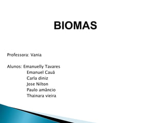 O documento descreve os principais biomas brasileiros, incluindo a Amazônia, Cerrado, Pantanal, Mata Atlântica, Caatinga e Pampas. Detalha as características de cada bioma, como vegetação, clima e localização geográfica. Também menciona a grande biodiversidade encontrada no Brasil e fatores que influenciam a distribuição de espécies como latitude e altitude.