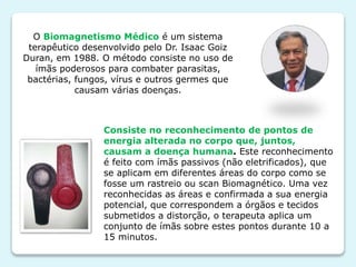 O documento descreve o que é Biomagnetismo Médico, um método terapêutico que usa ímãs para combater doenças. Ele explica como o Biomagnetismo equilibra os campos magnéticos do corpo para restaurar a saúde e lista várias condições que podem ser tratadas com este método.