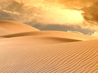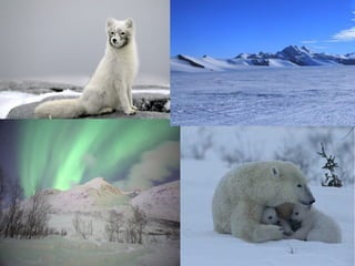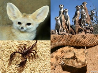 O documento descreve as características dos desertos, incluindo sua baixa precipitação anual, adaptações da fauna e flora à falta de água, e exemplos de desertos polares e onde são encontrados depósitos minerais.