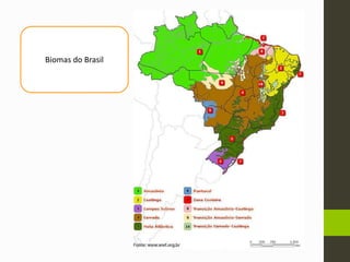 O documento descreve os principais biomas do Brasil, incluindo a Floresta Amazônica, Mata Atlântica, Cerrado, Caatinga, Pantanal, Mata de Araucárias, Campos Sulinos, e Manguezal, destacando suas características climáticas, vegetação, solos e importância.