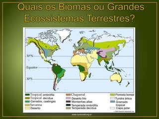 O documento descreve diferentes biomas, incluindo florestas tropicais, tundras e chaparrals, destacando suas características físicas, climáticas e de biodiversidade. As florestas tropicais são ricas em biodiversidade e localizadas nos trópicos, enquanto as tundras apresentam temperaturas baixas e vegetação adaptada ao frio. O chaparral é um bioma quente e seco, com vegetação arbustiva e fauna adaptada a condições extremas.