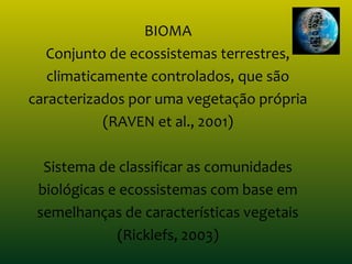O documento descreve os principais biomas brasileiros, incluindo suas características vegetação, clima e localização geográfica. São descritos os biomas da Amazônia, Cerrado, Caatinga, Mata Atlântica, Pampa, Pantanal e outros.