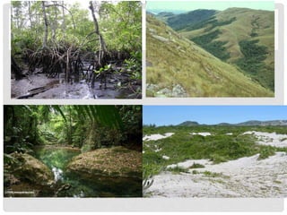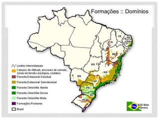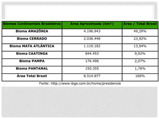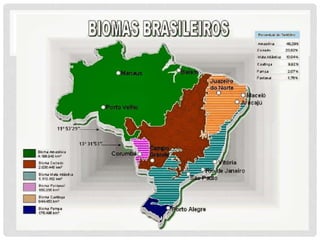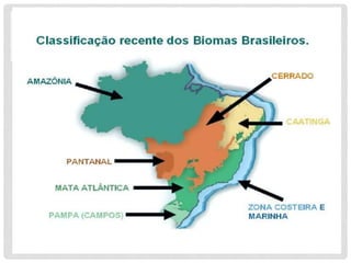 O documento descreve os principais biomas brasileiros, incluindo a Amazônia, Cerrado, Caatinga, Mata Atlântica, Pampa e Pantanal. Cada bioma possui características únicas de flora e fauna adaptadas às condições ambientais locais, como a vegetação rasteira e resistente ao fogo da Caatinga ou as árvores de copa aberta do Cerrado. O documento fornece detalhes sobre a localização geográfica, clima e espécies mais representativas de cada um desses importantes biomas bras