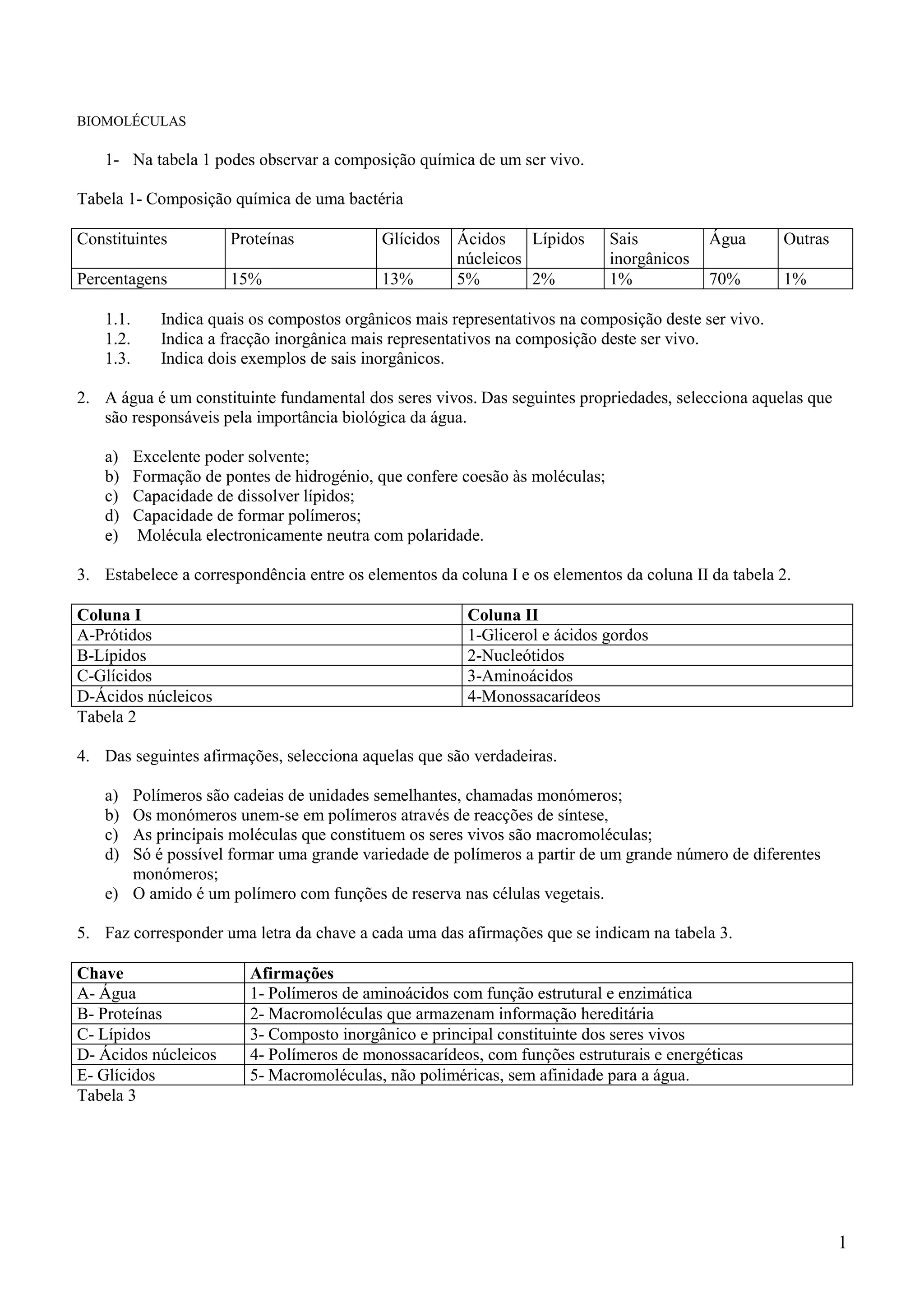 1) As proteínas e glícidos são os compostos orgânicos mais representativos nas bactérias, enquanto a água é a fração inorgânica mais abundante. 2) A água é essencial para os seres vivos devido à sua capacidade de formar pontes de hidrogénio e dissolver outras moléculas. 3) As enzimas ajudam a reduzir a energia necessária para reações químicas nos seres vivos.