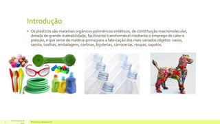 O documento discute bioplásticos e biopolímeros. Apresenta os problemas causados pelos plásticos convencionais e o potencial dos bioplásticos. Também descreve empresas que usam bioplásticos e previsões de crescimento para o mercado, com a demanda global de bioplásticos ultrapassando 1 milhão de toneladas métricas em 2015.