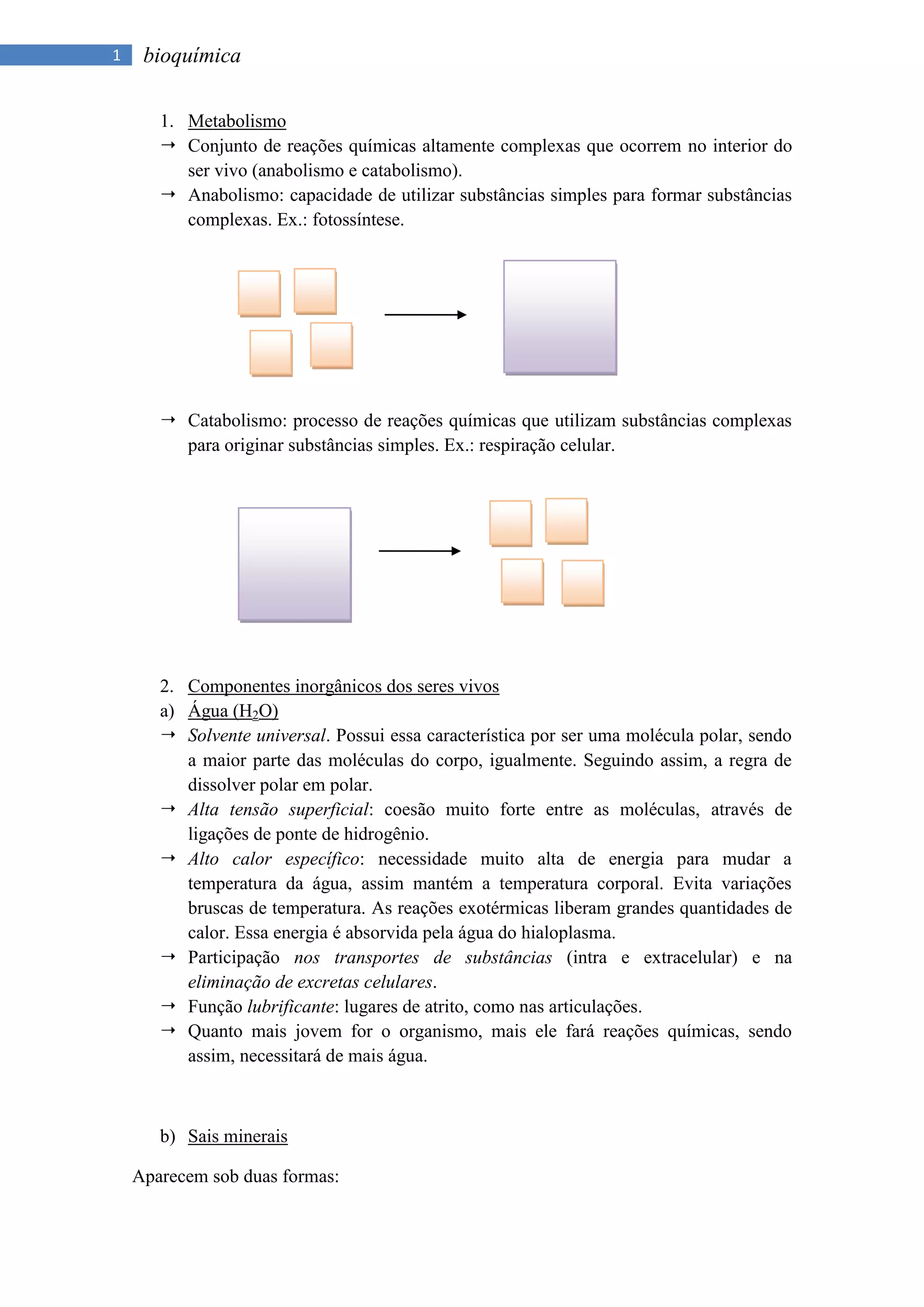 1. O documento discute os principais componentes bioquímicos dos seres vivos, incluindo o metabolismo, componentes inorgânicos como água e sais minerais, e componentes orgânicos como carboidratos, lipídios e suas funções.