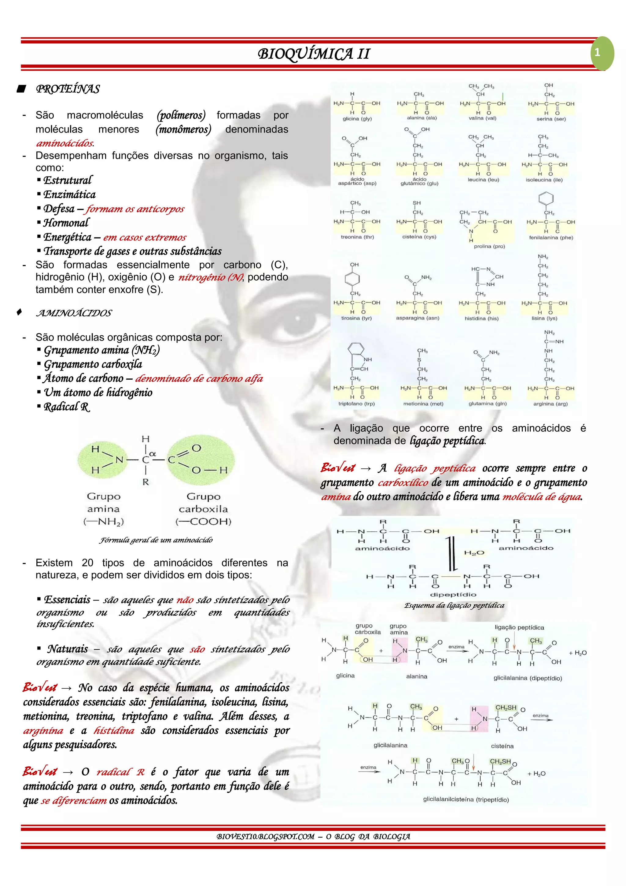 O documento discute as proteínas, aminoácidos, estrutura e função de proteínas e enzimas. Cobre tópicos como as quatro estruturas de proteínas (primária, secundária, terciária e quaternária), os 20 tipos de aminoácidos, a ligação peptídica, desnaturação proteica, enzimas como catalisadores biológicos, e anticorpos e vacinas.