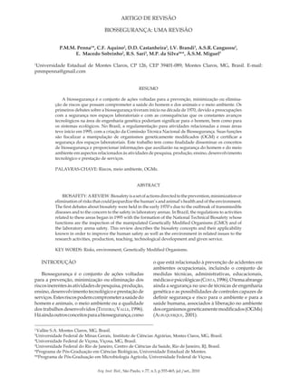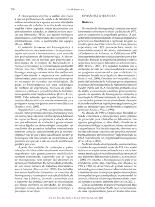 O documento discute biossegurança, definindo-a como um conjunto de ações para prevenir riscos à saúde humana e ambiental. A biossegurança surgiu na década de 1970 devido a preocupações com segurança em laboratórios e riscos da engenharia genética. No Brasil, a regulamentação começou em 1995 com a Comissão Técnica Nacional de Biossegurança. O texto revisa os conceitos e histórico da biossegurança.