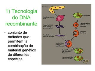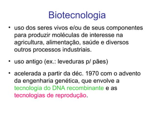 A biotecnologia envolve o uso de seres vivos e seus componentes para produzir moléculas de interesse. Ela se acelerou a partir da década de 1970 com a engenharia genética, incluindo o DNA recombinante e as tecnologias de reprodução. O DNA recombinante permite combinar material genético de diferentes espécies para aplicações como medicamentos, vacinas e alimentos transgênicos. As tecnologias da reprodução incluem a fertilização in vitro e a clonagem para produção de embriões sem fertilização in vivo.