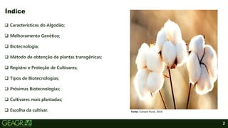 O documento discute a biotecnologia do algodoeiro, abordando suas características, melhoramento genético, métodos de obtenção de plantas transgênicas, tipos de biotecnologias, cultivares mais plantadas e fatores para escolha da cultivar.