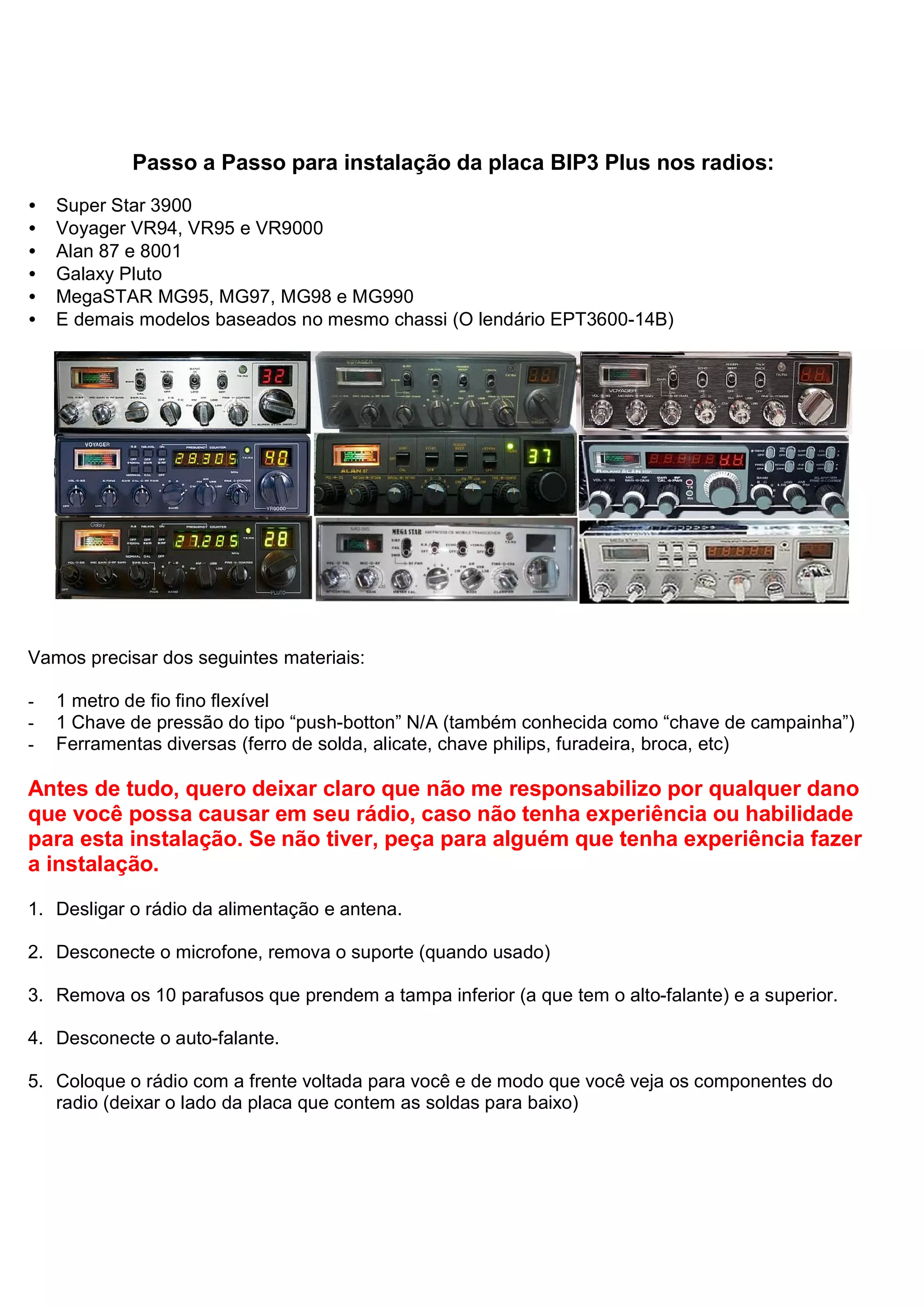 O documento fornece instruções passo a passo para instalação de uma placa BIP3 Plus em vários modelos de rádios, incluindo Super Star 3900 e Voyager, para adicionar novas funções de bip ao rádio, como bip duplo. Ele lista os materiais e ferramentas necessárias, destaca a necessidade de experiência para realizar a instalação e não se responsabilizar por danos, e fornece detalhes sobre onde cortar fios e soldar outros para conectar a nova placa.