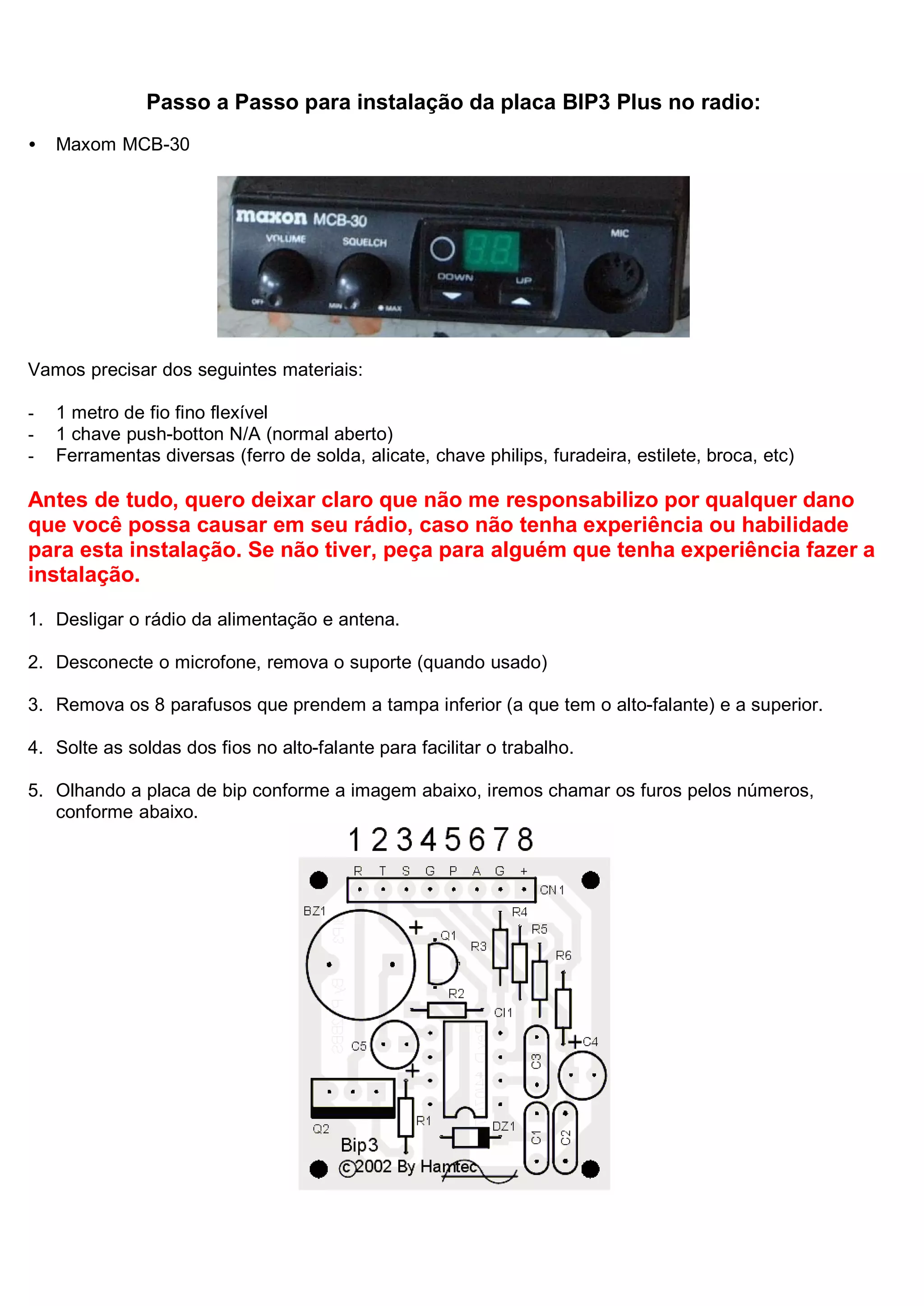 1) Soldar fios entre pontos específicos na placa do rádio e na placa BIP3 Plus;