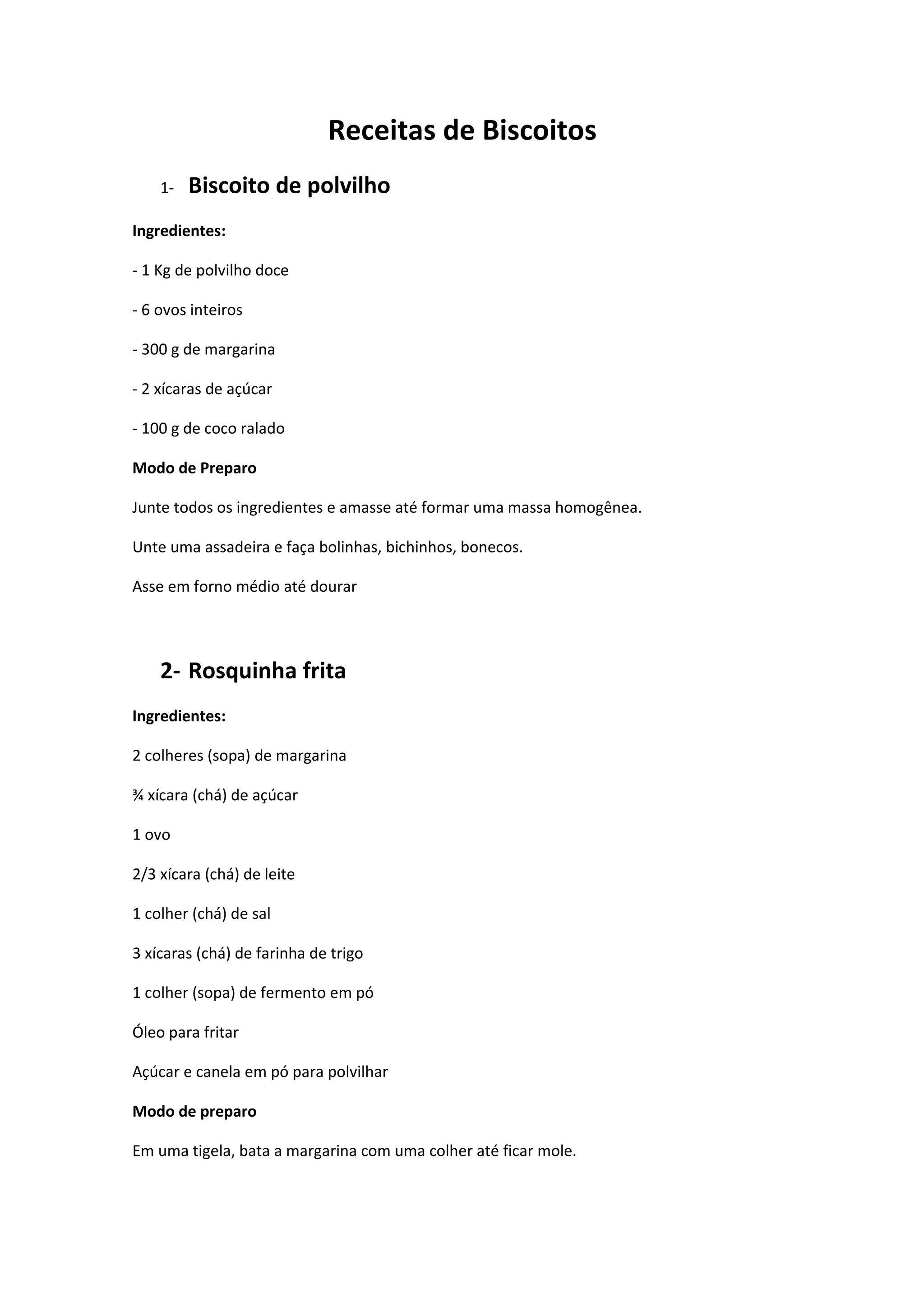 O documento fornece receitas para dois tipos de biscoitos: Biscoito de polvilho, feito com polvilho doce, ovos, margarina, açúcar e coco ralado, e Rosquinha frita, feita com margarina, açúcar, ovo, leite, farinha de trigo e fermento em pó, frita e polvilhada com açúcar e canela.