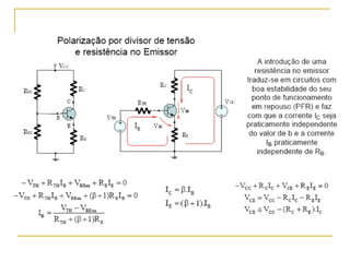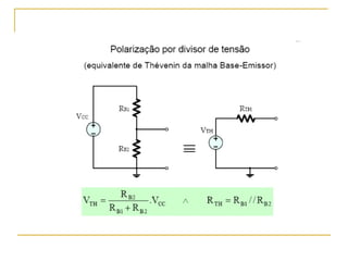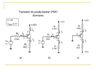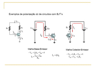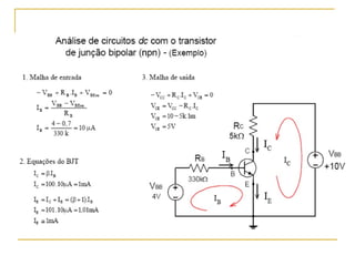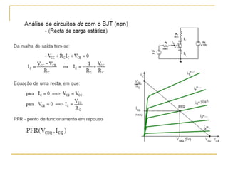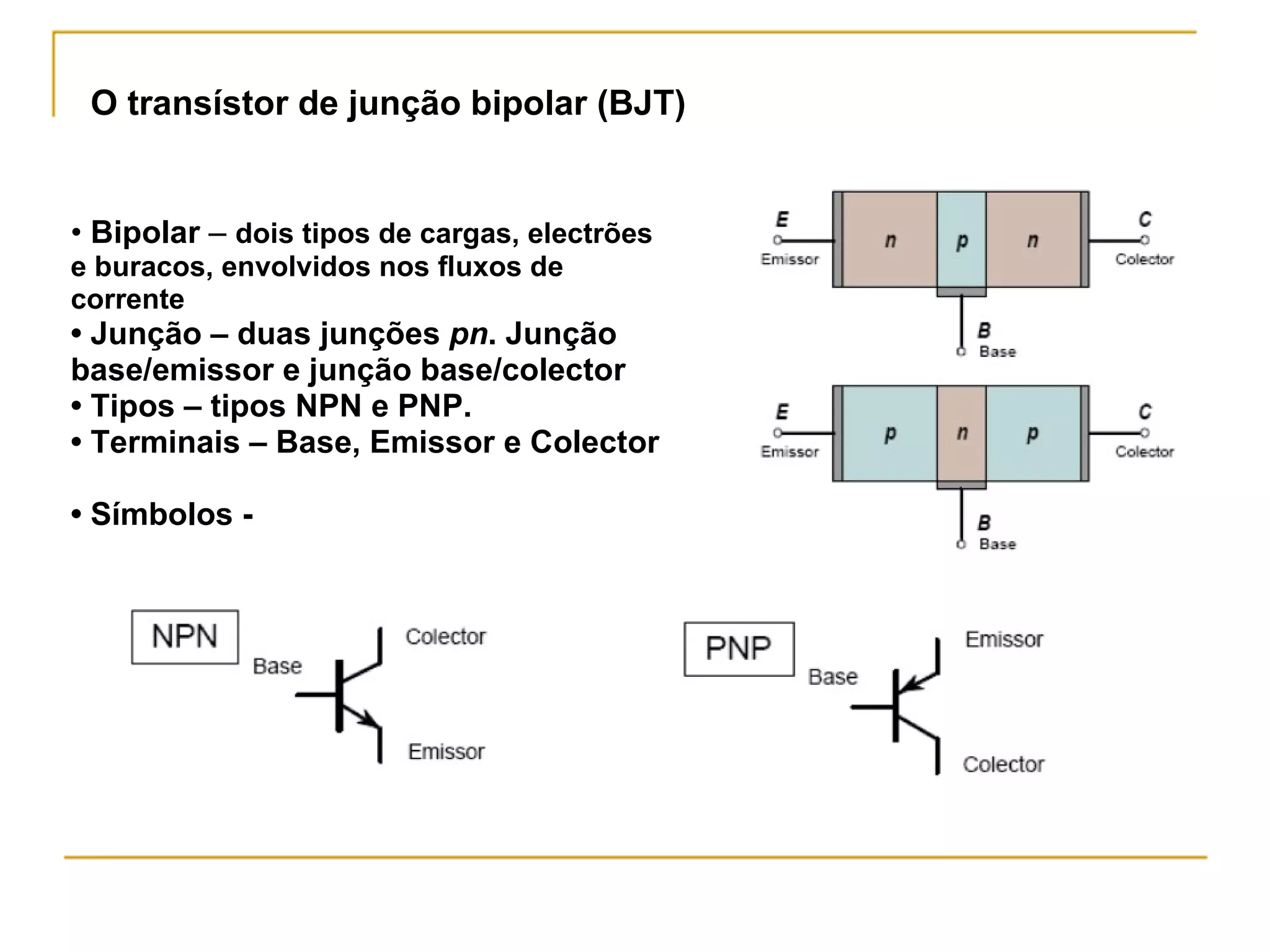 O transístor de junção bipolar (BJT) possui duas junções pn e opera com dois tipos de cargas, eletrões e buracos. Quando polarizado diretamente no emissor e inversamente no coletor, ocorrem fluxos de corrente que permitem o funcionamento do BJT como um amplificador controlado por tensão ou corrente. O BJT do tipo NPN opera de forma semelhante ao PNP, com as correntes sendo principalmente devidas a fluxos de eletrões ou buracos, dependendo do tipo.