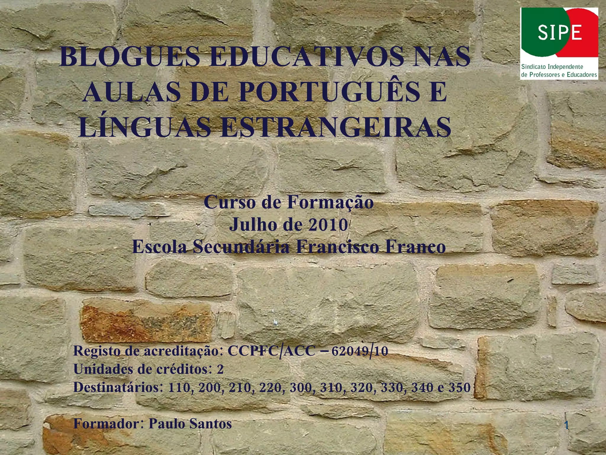 Curso de FormaçãoJulho de 2010 Escola Secundária Francisco Franco BLOGUES EDUCATIVOS NAS AULAS DE PORTUGUÊS E LÍNGUAS ESTRANGEIRAS Registo de acreditação: CCPFC/ACC – 62049/10 Unidades de créditos: 2 Destinatários: 110, 200, 210, 220, 300, 310, 320, 330, 340 e 350 Formador: Paulo Santos