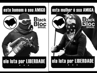 O documento analisa criticamente os Black Blocs, argumentando que eles cultivam uma ideologia necrófila, praticam violência armada de forma ofensiva em vez de defensiva, e comportam-se como militantes guerreiros, tendo um papel regressivo nas manifestações e alienando a participação das pessoas. Além disso, os Black Blocs agem na prática como uma organização, não como uma mera tática, e acabam funcionando como força auxiliar do PT no Brasil.