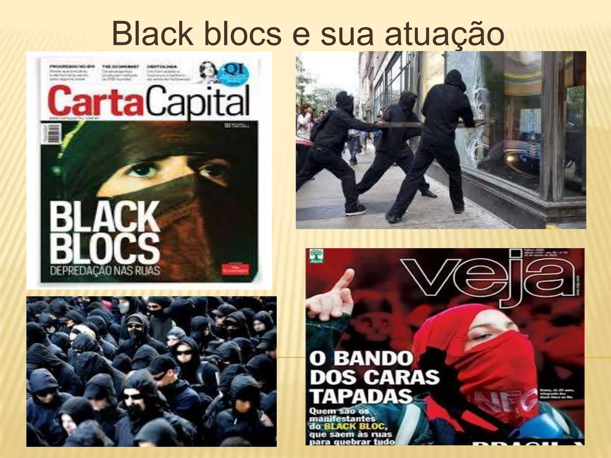 O documento descreve a origem e atuação dos black blocs. Os black blocs surgiram na Itália na década de 1970 como um movimento radical de contracultura independente da esquerda tradicional. Eles se espalharam pela Europa e Estados Unidos, usando táticas de protesto como destruição de propriedade para chamar atenção contra corporações e governos. Os black blocs usam roupas e máscaras pretas para dificultar identificação e parecer uma massa uniforme, promovendo solidariedade entre os participantes.
