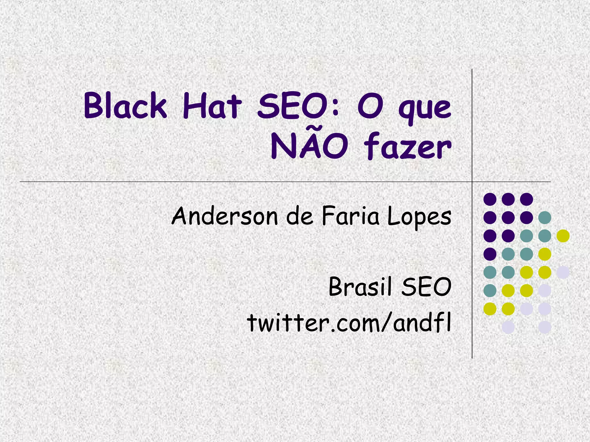 O documento discute técnicas de Black Hat SEO que não devem ser utilizadas, como texto escondido, doorway pages, link farms, keyword stuffing e cloacking. Também aborda mitos como conteúdo duplicado e diretórios pagos, além de explicar como identificar punições do Google e o processo de pedido de reconsideração.