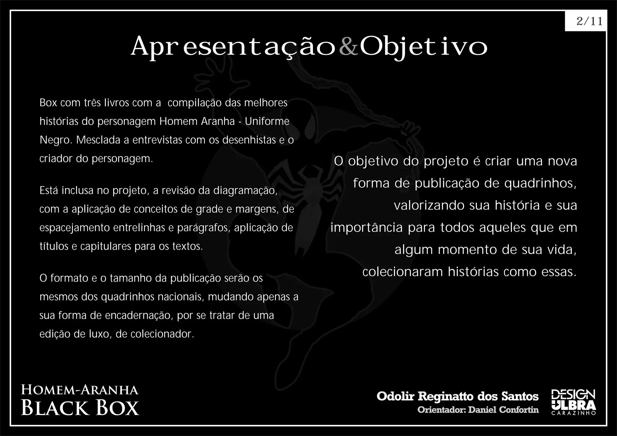 O documento descreve o projeto de um box com três livros contendo as melhores histórias do Homem Aranha, incluindo entrevistas com os criadores. O objetivo é criar uma nova forma de publicar quadrinhos valorizando a história do personagem. Referências como livros de Calvin e Hobbes e a trilogia Fronteiras do Universo foram consideradas. Desenhos conceituais e a solução final do box com símbolos do Aranha-Negro e Venom são apresentados, junto com detalhes de projeto gráfico dos livros.