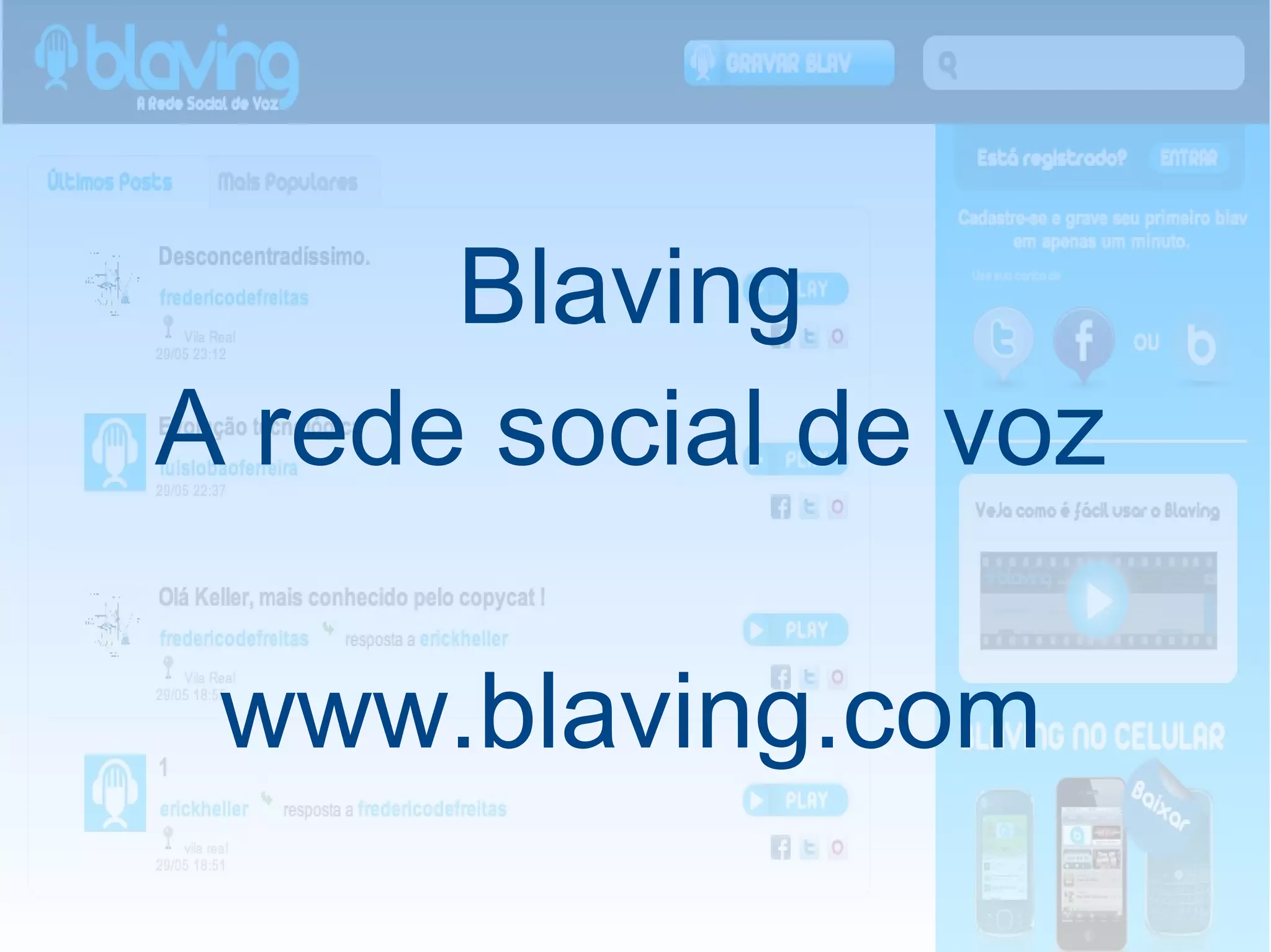 O documento descreve a rede social Blaving, que permite aos usuários gravar e compartilhar mensagens de áudio curtas. O Blaving funciona de forma semelhante ao Twitter, mas usa voz em vez de texto. Os usuários podem gravar e postar "blavs" (áudios curtos) e compartilhá-los em outras redes sociais. O documento também explica como fazer login, gravar e editar blavs na plataforma.