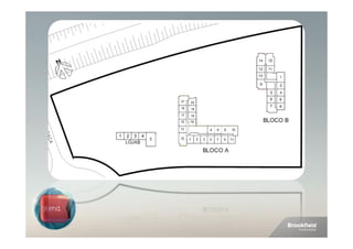 O documento descreve um empreendimento residencial localizado em Águas Claras, no Distrito Federal. O empreendimento conta com 2 torres (Bloco A e Bloco B) com 381 e 276 unidades de 1 quarto e 20 e 46 unidades de 2 quartos, respectivamente. O empreendimento oferece diversas áreas comuns como salão de festas, academia, piscinas e salão de jogos.