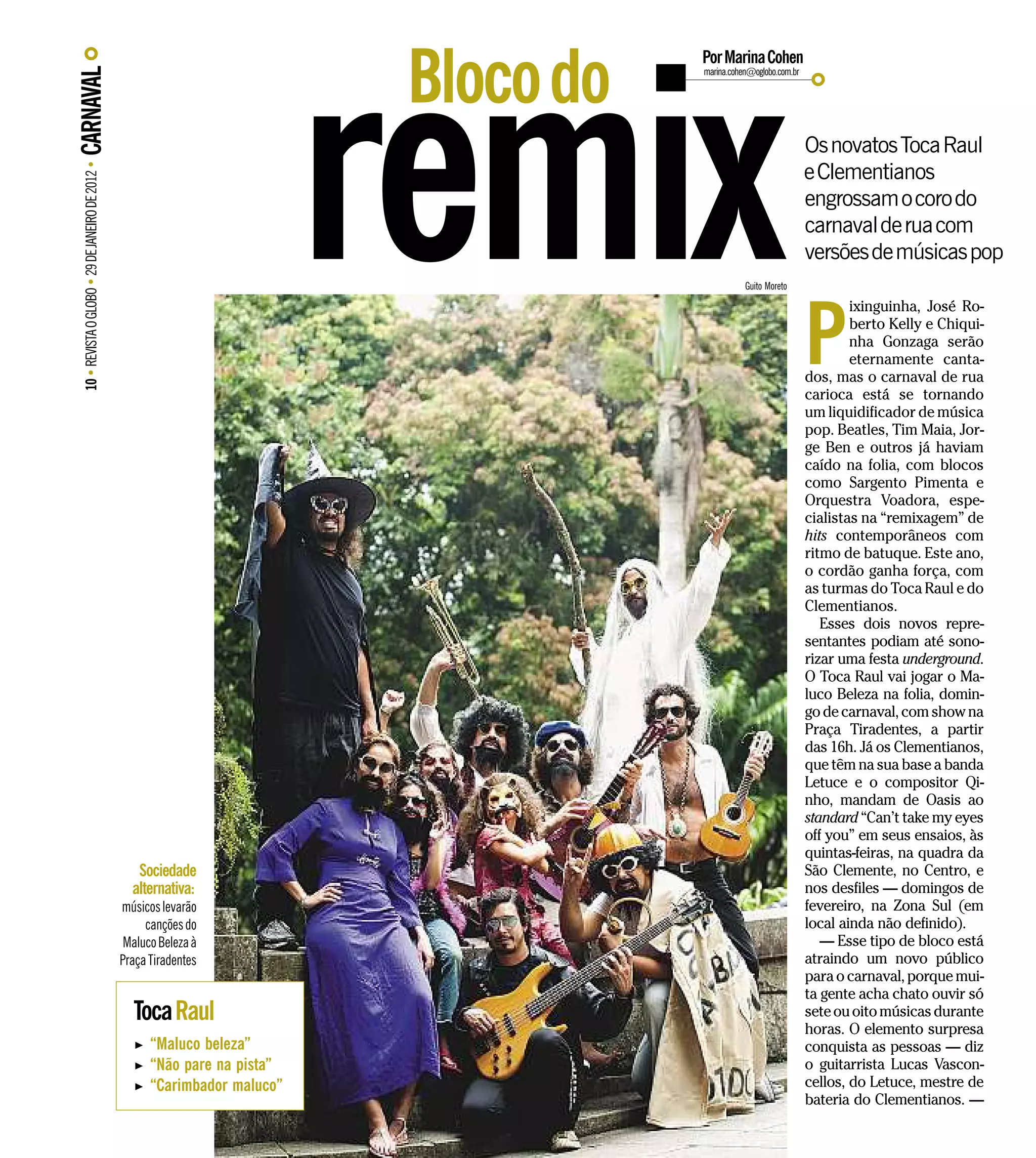 remix CARNAVAL O Bloco do Por Marina Cohen marina.cohen@oglobo.com.br O Os novatos Toca Raul e Clementianos 10 • REVISTA O GLOBO • 29 DE JANEIRO DE 2012 • engrossam o coro do carnaval de rua com versões de músicas pop Guito Moreto P ixinguinha, José Ro- berto Kelly e Chiqui- nha Gonzaga serão eternamente canta- dos, mas o carnaval de rua carioca está se tornando um liquidificador de música pop. Beatles, Tim Maia, Jor- ge Ben e outros já haviam caído na folia, com blocos como Sargento Pimenta e Orquestra Voadora, espe- cialistas na “remixagem” de hits contemporâneos com ritmo de batuque. Este ano, o cordão ganha força, com as turmas do Toca Raul e do Clementianos. Esses dois novos repre- sentantes podiam até sono- rizar uma festa underground. O Toca Raul vai jogar o Ma- luco Beleza na folia, domin- go de carnaval, com show na Praça Tiradentes, a partir das 16h. Já os Clementianos, que têm na sua base a banda Letuce e o compositor Qi- nho, mandam de Oasis ao standard “Can’t take my eyes off you” em seus ensaios, às quintas-feiras, na quadra da Sociedade São Clemente, no Centro, e alternativa: nos desfiles — domingos de músicos levarão fevereiro, na Zona Sul (em canções do local ainda não definido). Maluco Beleza à — Esse tipo de bloco está Praça Tiradentes atraindo um novo público para o carnaval, porque mui- ta gente acha chato ouvir só TocaRaul sete ou oito músicas durante horas. O elemento surpresa a “Maluco beleza” conquista as pessoas — diz a “Não pare na pista” o guitarrista Lucas Vascon- a “Carimbador maluco” cellos, do Letuce, mestre de bateria do Clementianos. —