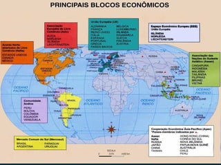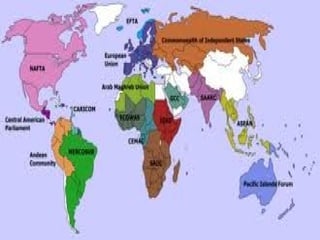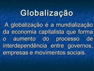 A globalização é a mundialização da economia capitalista que forma o aumento do processo de interdependência entre governos, empresas e movimentos sociais. Os principais fatores que contribuíram para o surgimento da globalização foram o mercantilismo, a revolução industrial, o surgimento de corporações multinacionais e as duas guerras mundiais. Atualmente, blocos econômicos regionais como o Mercosul, a União Europeia e a ASEAN promovem a integração econômica entre seus membros.