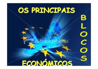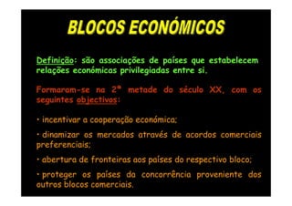 O documento define os principais blocos econômicos como associações de países que estabelecem relações econômicas privilegiadas, citando como objetivos a cooperação econômica, mercados com acordos comerciais preferenciais e abertura de fronteiras. Descreve os principais blocos como a União Europeia, NAFTA, Mercosul, APEC e ASEAN.