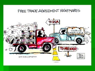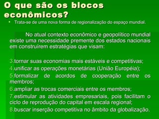 O documento discute blocos econômicos, definindo-os como uma forma de regionalização da economia mundial. Apresenta a teoria dos blocos regionais e do NAFTA, incluindo seus objetivos de integrar as economias do Canadá, Estados Unidos e México através da livre circulação de mercadorias e redução de barreiras alfandegárias entre os países membros. Também discute desigualdades econômicas entre os membros do NAFTA.