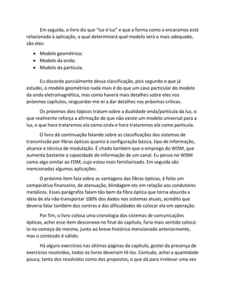 O documento resume os principais pontos abordados nos capítulos 1 a 4 de um livro sobre comunicações ópticas. O capítulo 1 discute o histórico das comunicações ópticas e componentes básicos de sistemas de fibra óptica. Os capítulos 2 e 3 abordam conceitos de óptica geométrica e eletromagnética aplicados à propagação da luz em fibras. O capítulo 4 trata da óptica integrada e guias de onda, definindo modos de propagação em fibras.