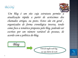 O documento discute o que é um blog, seus tipos principais e como criar e editar posts em blogs. Explica que um blog permite atualizações rápidas de artigos organizados cronologicamente inversa e que leitores podem comentar. Também fornece instruções passo a passo para criação de um blog no Blogger e inserção de vídeos, imagens e links.