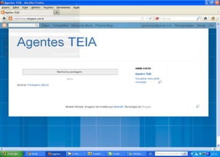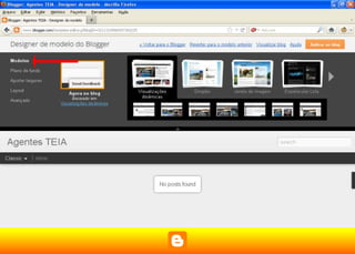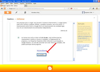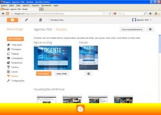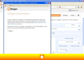 O documento fornece instruções passo a passo para configurar um blog no Blogger. Ele explica como criar uma conta no Blogger, configurar um novo blog com título, endereço e modelo, personalizar o layout e design do blog, adicionar gadgets como AdSense, e começar a postar conteúdo no blog recém-criado.