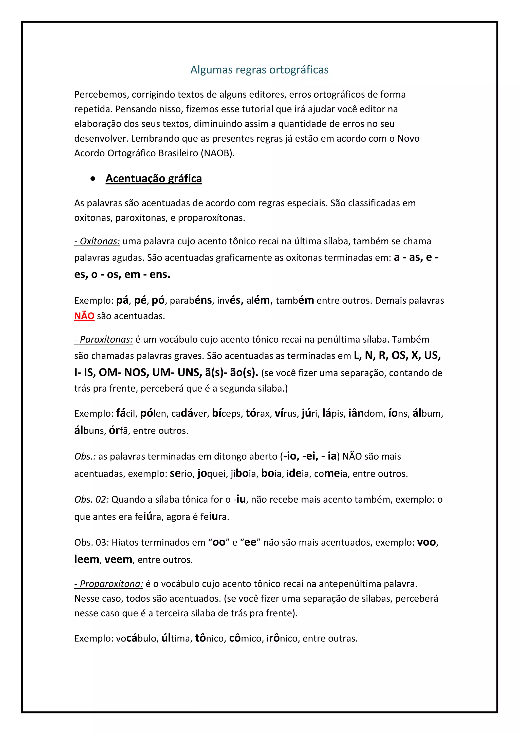 Este documento fornece instruções sobre regras ortográficas brasileiras, incluindo acentuação, homônimos, uso de crase e outras palavras que causam confusão. Explica como acentuar oxítonas, paroxítonas e proparoxítonas e esclarece a diferença entre palavras como "nós" e "nos", "além" e "alem", e outros pares problemáticos. Também discute o uso correto de "à", "há", "a", "onde" e "a