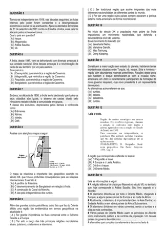 (1) O documento apresenta uma nota de prova com questões de geografia sobre diversos temas como países, regiões e eventos históricos; (2) As questões abordam tópicos como a independência do Afeganistão, o movimento nacionalista indiano liderado por Gandhi, o conflito entre Índia e Paquistão por Caxemira, o sistema de castas na Índia, a partilha da Palestina e a importância geopolítica do Oriente Médio; (3) A prova avalia o conhecimento dos