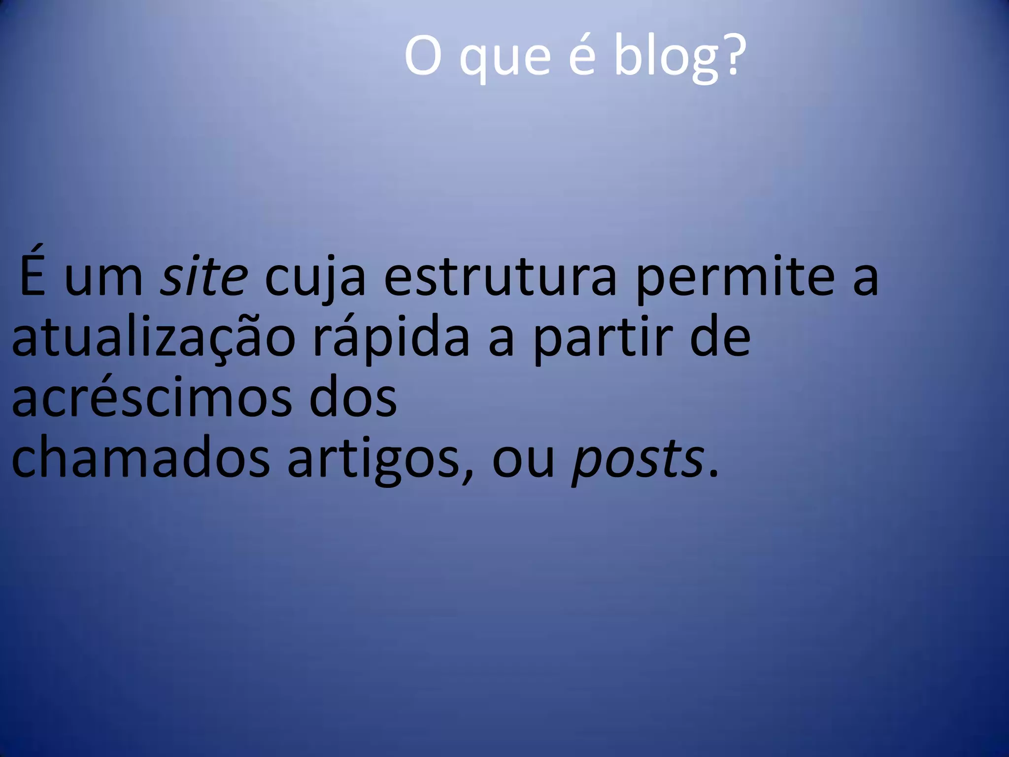 Blogs permitem atualizações rápidas através de posts. Surgiram em 1997 com o termo "weblog" e permitem mais interatividade do que sites, expressando opiniões pessoais de forma espontânea. Posts frequentes e interação com visitantes são importantes, e os direitos autorais pertencem ao autor.