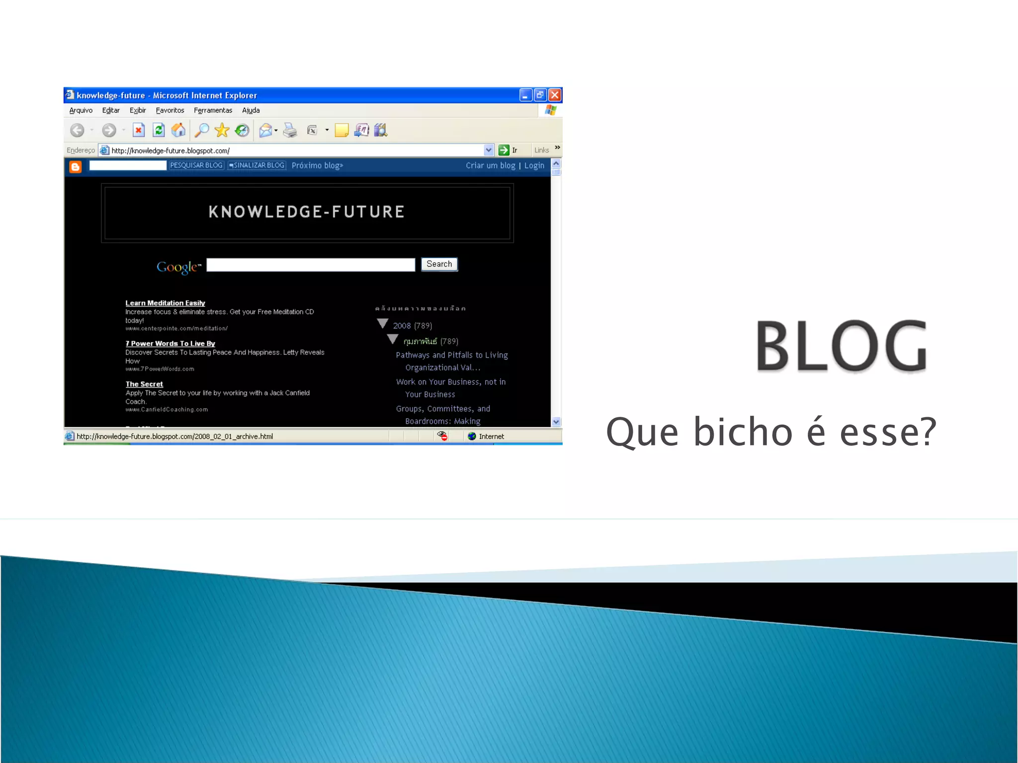 Este documento explica o que é um blog, como ele funciona e seus usos. Um blog é uma página da web atualizada frequentemente com pequenos parágrafos em ordem cronológica, como um diário ou jornal online. Blogs podem cobrir qualquer tópico e ser pessoais ou colaborativos. Eles também são úteis para comunicação entre grupos.
