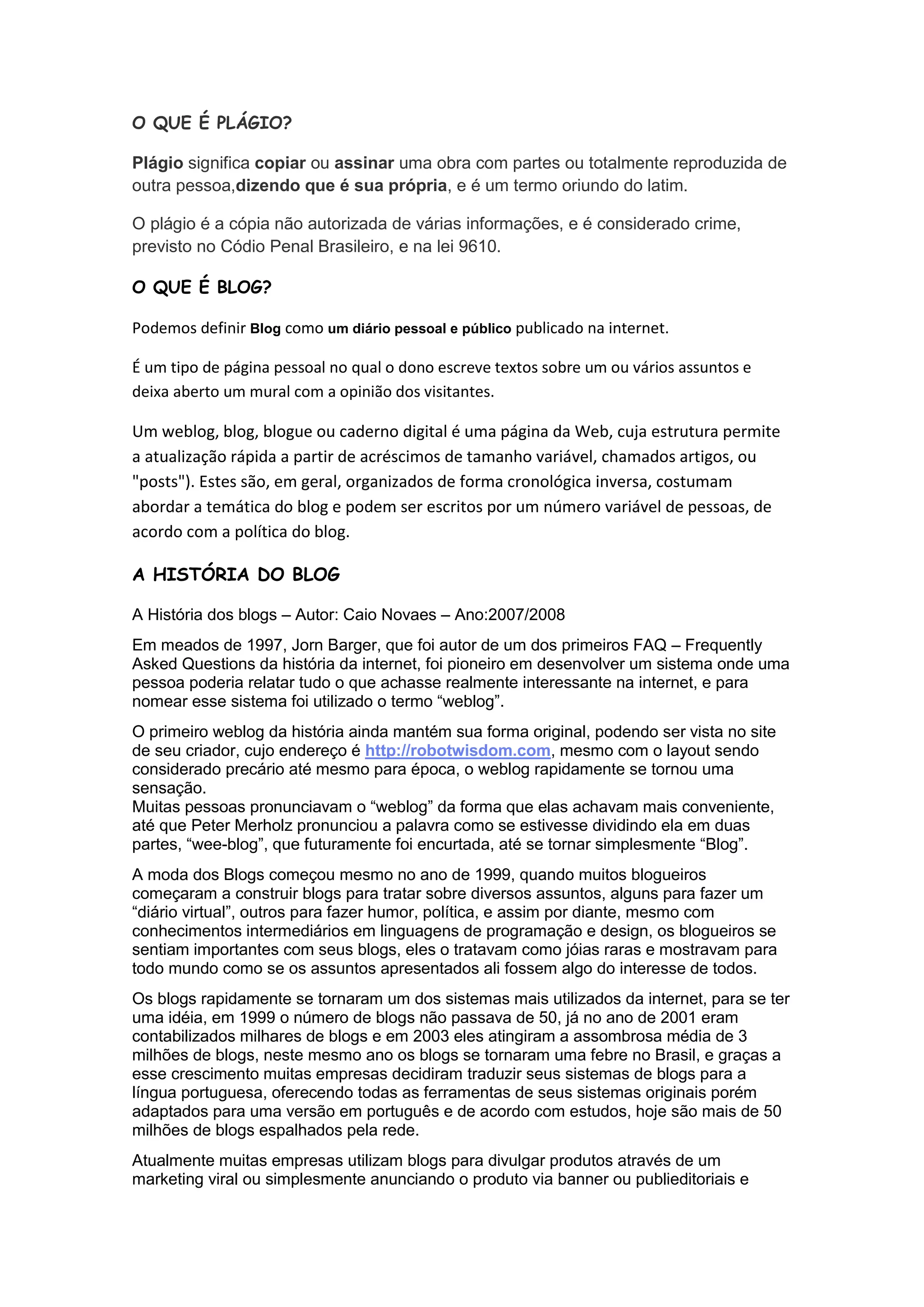 O documento discute o que é plágio e blog, além de resumir a história dos blogs. Começa definindo plágio como cópia não autorizada de informações e considerado crime. Em seguida define blog como um diário pessoal público na internet. Resume que o primeiro weblog surgiu em 1997 e que os blogs se popularizaram rapidamente na década de 2000, chegando a 50 milhões em 2003.