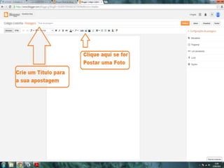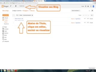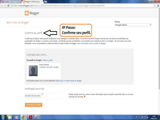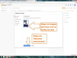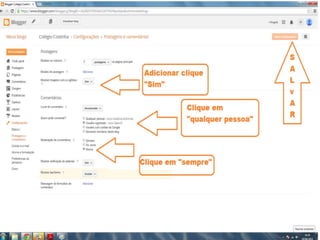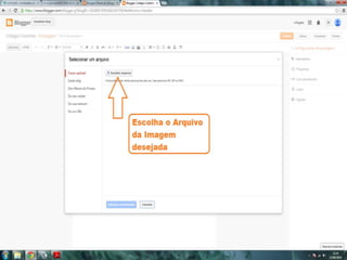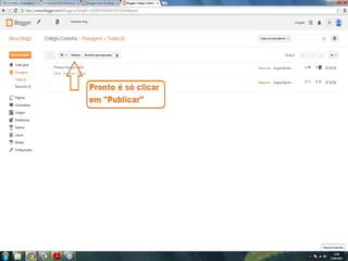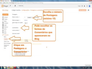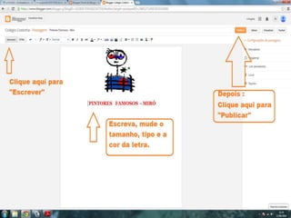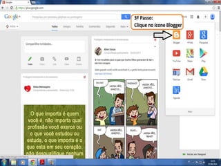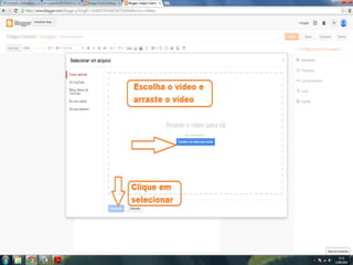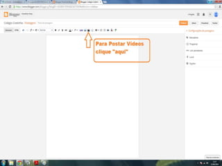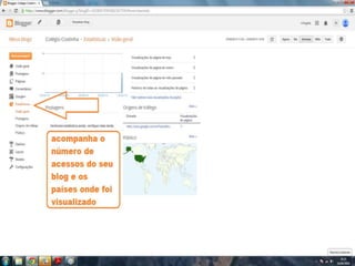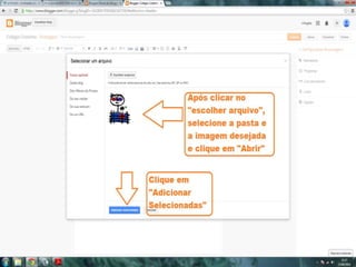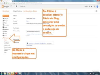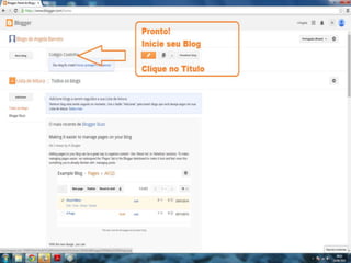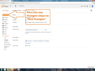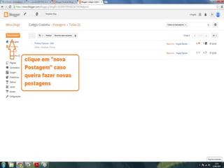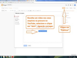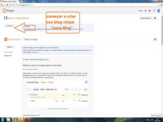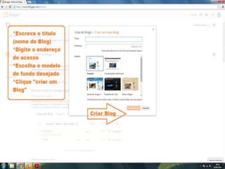 O documento fornece dicas sobre como escrever novas postagens, acompanhar blogs favoritos e acessar recursos em um blog. Também fornece instruções sobre como mudar o fundo de um blog visitando um site de templates e links para vídeos no YouTube sobre blogs.