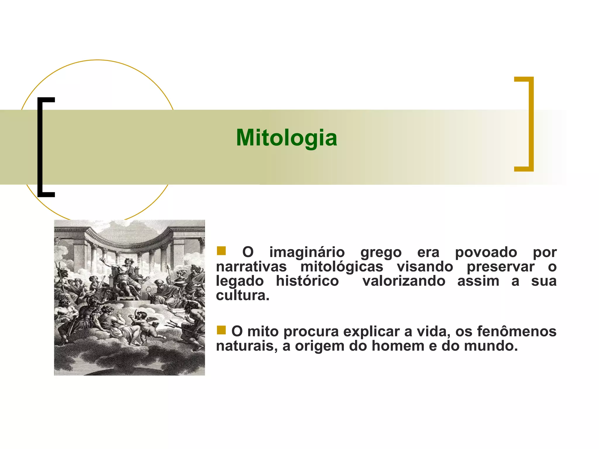Mitologia O imagináriogrego era povoado por narrativas mitológicas visando preservar o legado histórico valorizando assim a sua cultura. O mito procura explicar a vida, os fenômenos naturais, a origem do homem e do mundo.