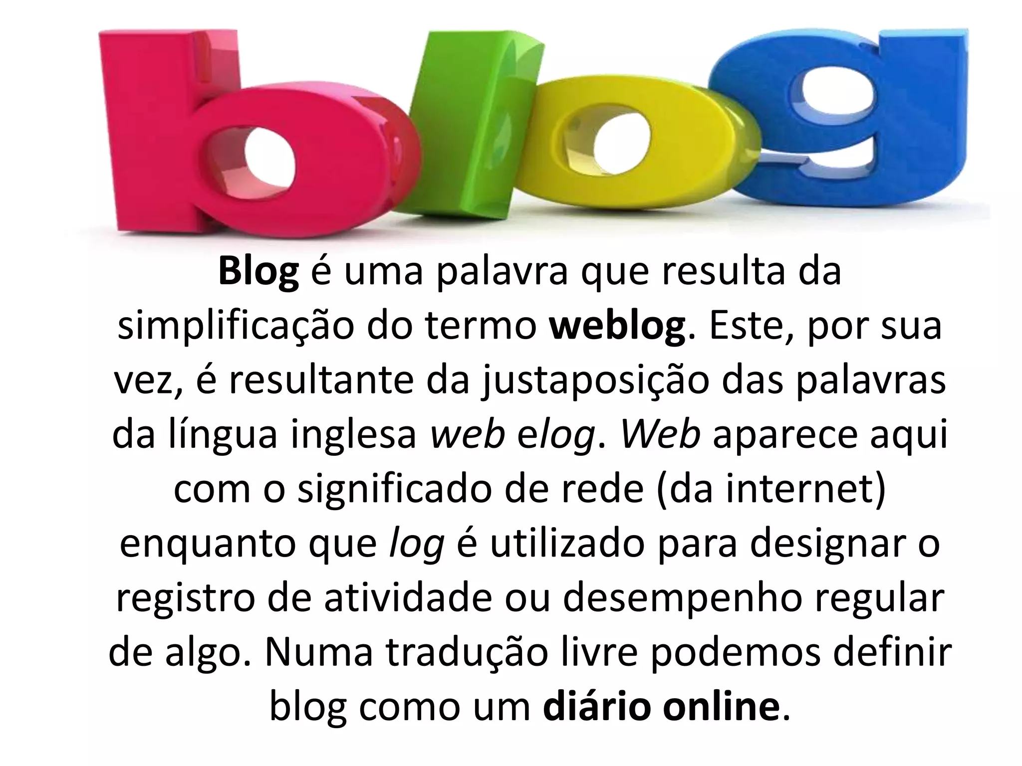 1) Blogs surgiram como uma simplificação da palavra weblog, que significa registro online de atividades ou desempenho regular;