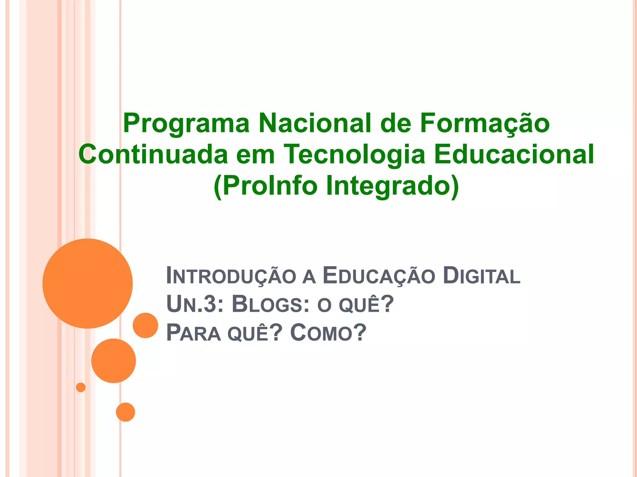 O documento discute o que são blogs, seus objetivos e como criá-los. Blogs permitem que qualquer pessoa publique conteúdo online. Eles podem ser usados como diários digitais e para compartilhar notícias. O documento também explica como criar um blog gratuitamente usando uma conta Google e o serviço Blogspot.