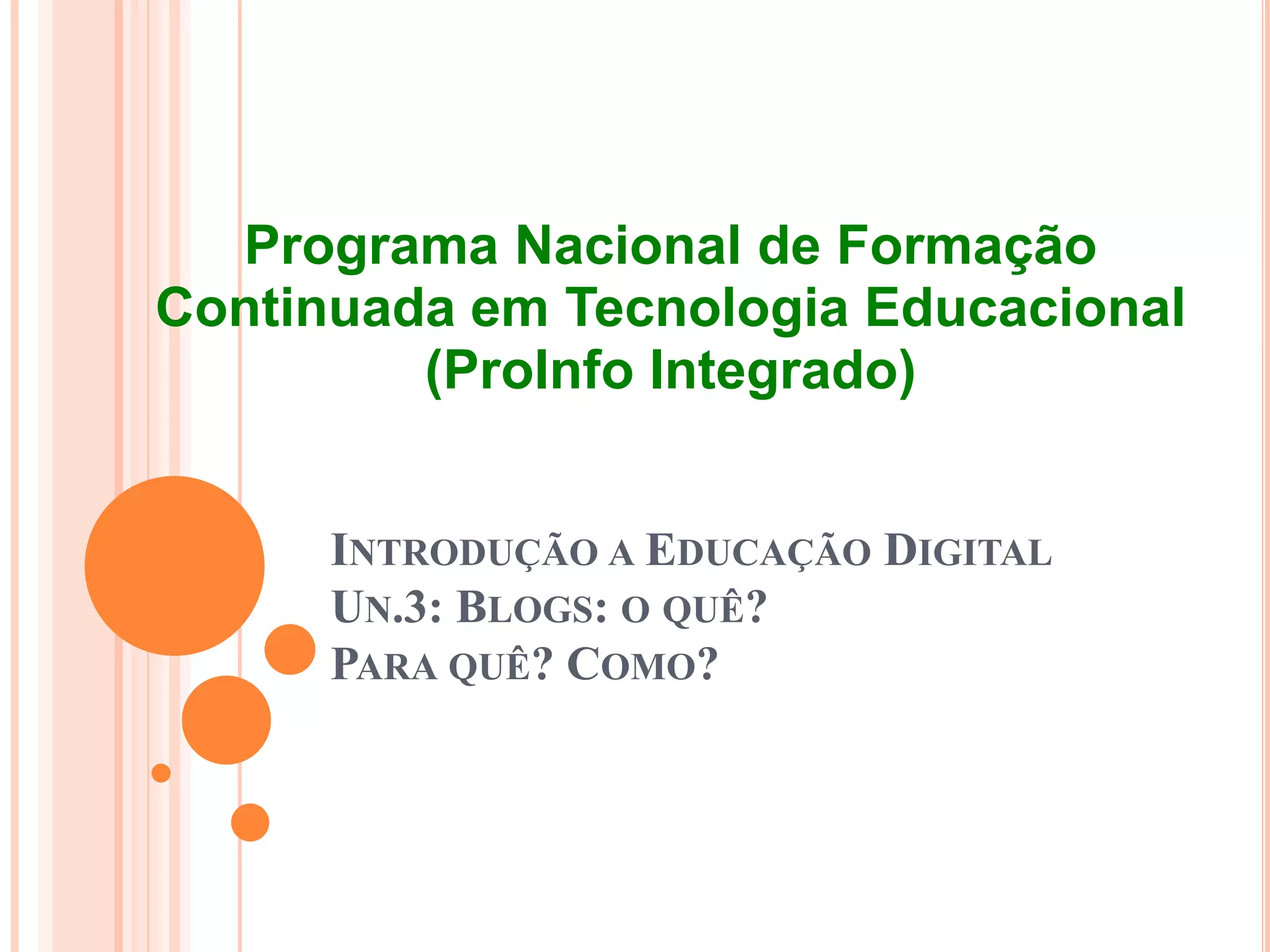 O documento discute o que são blogs, para que servem e como criá-los. Blogs são diários digitais onde qualquer pessoa pode publicar conteúdo na internet. Eles permitem a comunicação e interatividade através de comentários, links e compartilhamento de fotos e vídeos. O texto ensina como criar um blog gratuitamente usando uma conta Google e o serviço Blogspot.
