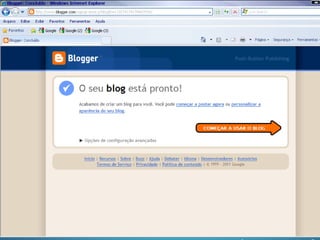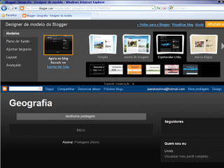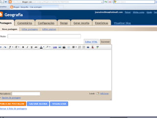O documento discute o que é um blog, como pode ser usado como ferramenta pedagógica e no ensino da geografia. Explica que um blog é um site na web onde usuários publicam conteúdo em formato de entradas. Destaca que blogs podem ser usados como portfólios, para debates e colaboração. Também discute como professores podem usar blogs para se aproximar dos alunos e enriquecer conteúdos com mídia.