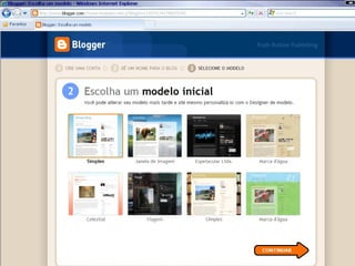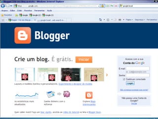 O documento discute o que é um blog, como ele pode ser usado e como criar um. Um blog é um site na web usado para compartilhar informações. Eles podem ser usados como portfólios, para debates ou trabalho em equipe. Blogs também podem ser usados como ferramentas pedagógicas, permitindo que professores e alunos interajam e compartilhem conteúdo. Na geografia, blogs podem apoiar o ensino apresentando recursos sobre lugares. O documento fornece instruções passo a passo para criar um blog gratuitamente