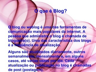 O documento discute o uso de blogs como ferramenta pedagógica em escolas. Ele explica o que é um blog, como pode ser usado para apoiar novos papéis de alunos e professores, trabalhos interdisciplinares e envolver a comunidade. Também destaca as potencialidades dos blogs como envolver mais os alunos, comunicação, trabalhos em equipe e discutir textos.