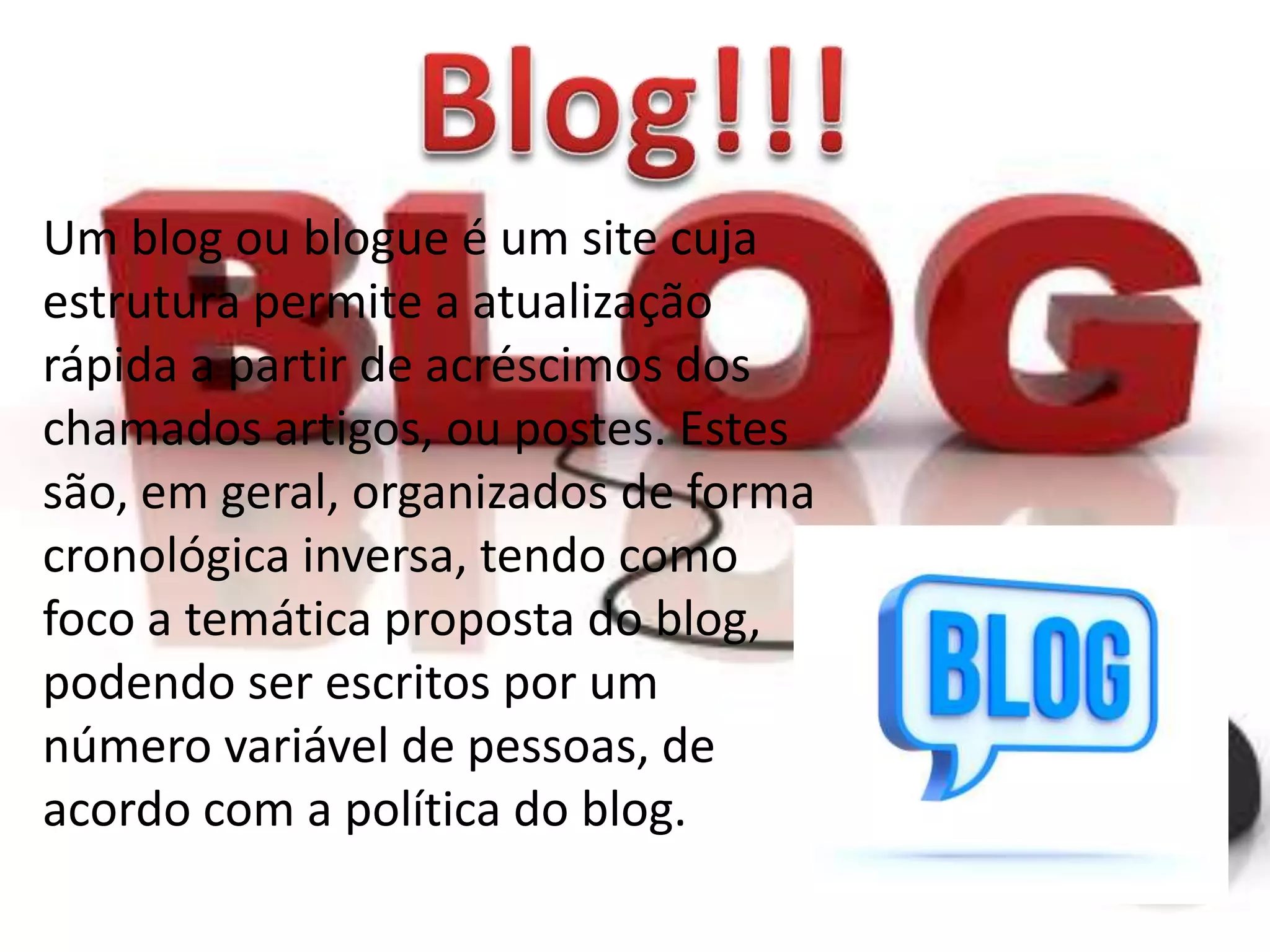 Um blog é um site que permite atualizações rápidas através de "postagens" organizadas cronologicamente inversamente. Os blogs geralmente focam em uma temática e podem ser escritos por várias pessoas. O termo "blog" foi popularizado por Peter Merholz em 1999 e Evan Williams aplicou-o ao serviço Blogger, levando à popularização. Os blogs evoluíram dos diários online manuais para ferramentas que facilitam a publicação automática de postagens.