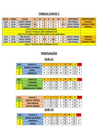 O documento apresenta tabelas de jogos e classificações de três copas de futebol nas categorias sub-11, sub-13 e sub-15 realizadas em Santa Maria de Jetibá. As tabelas detalham datas, horários, locais e resultados dos jogos das chaves A, B e C de cada categoria. Há também uma tabela com a classificação geral e informações sobre as fases finais e repescagens dos torneios.