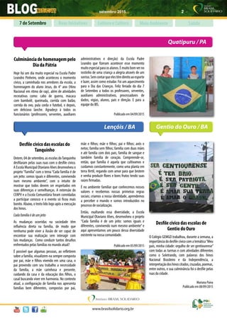 O documento discute como escolas no Brasil aproveitaram o feriado de 7 de setembro para promover atividades educacionais sobre civismo, cultura e aprendizagem. Relata exemplos de desfiles cívicos, projetos sobre meio ambiente, saúde e leitura realizados por escolas em diversas cidades brasileiras na data.