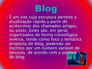 O documento descreve o que é um blog. Um blog é um site onde posts são organizados de forma cronológica inversa e atualizados frequentemente. Blogs geralmente cobrem um tópico específico e permitem comentários de leitores. Existem diferentes tipos de blogs como pessoais, corporativos e de gênero específico.