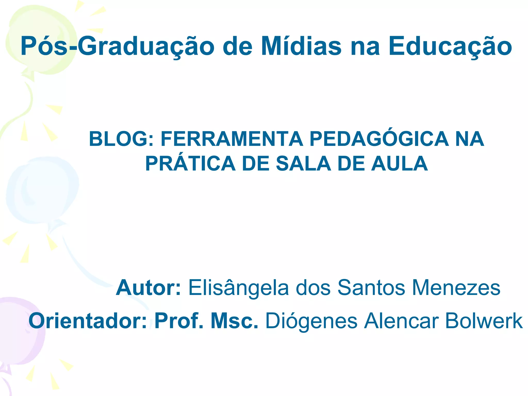 O documento discute o uso de blogs como ferramenta pedagógica em sala de aula. Ele apresenta uma pesquisa com professores sobre o uso de tecnologias e como eles classificam o uso de blogs. Os resultados mostram que blogs podem fortalecer o processo educativo, promover atividades de autoavaliação e ser usados para registrar atividades em sala de aula.